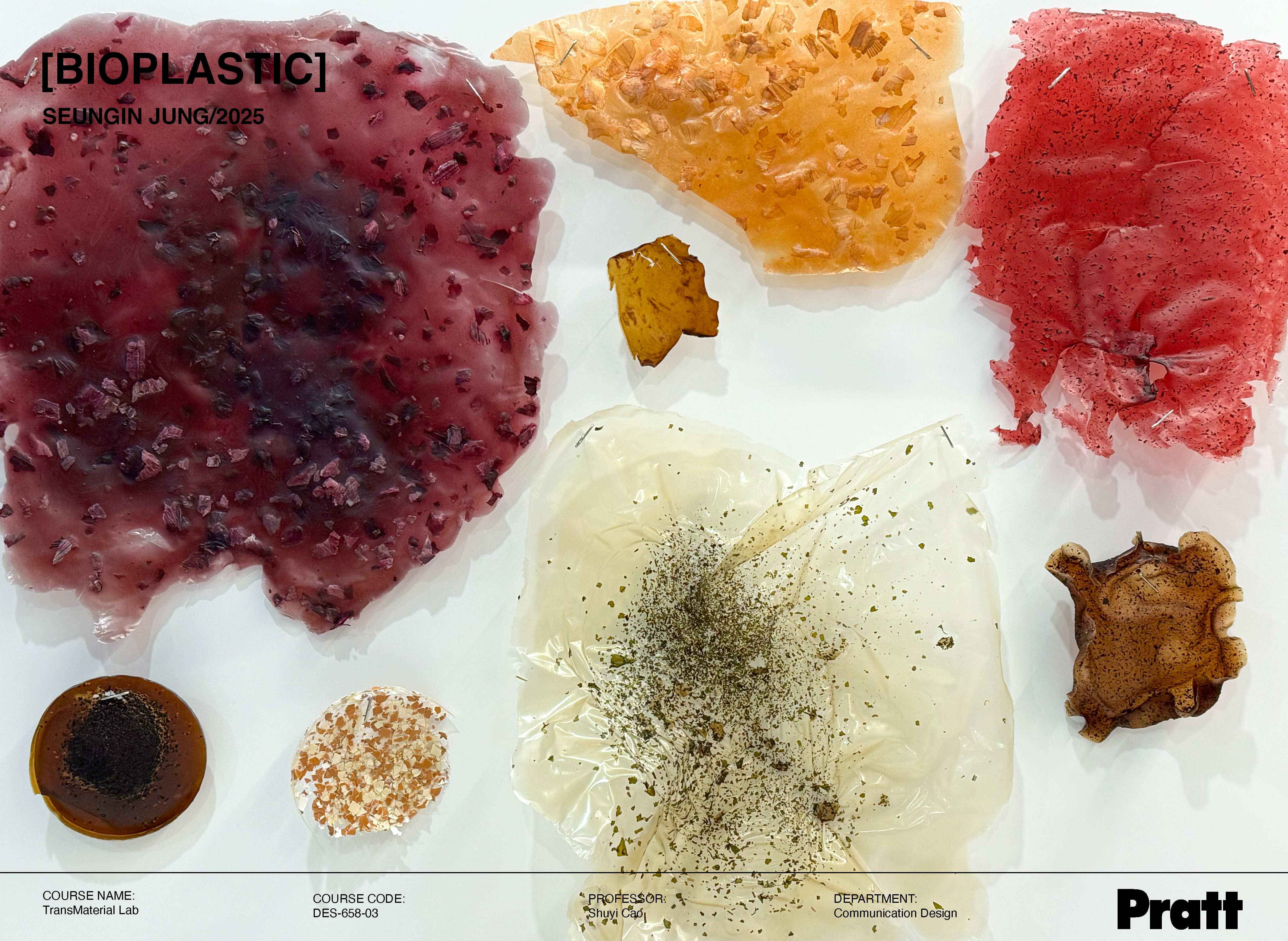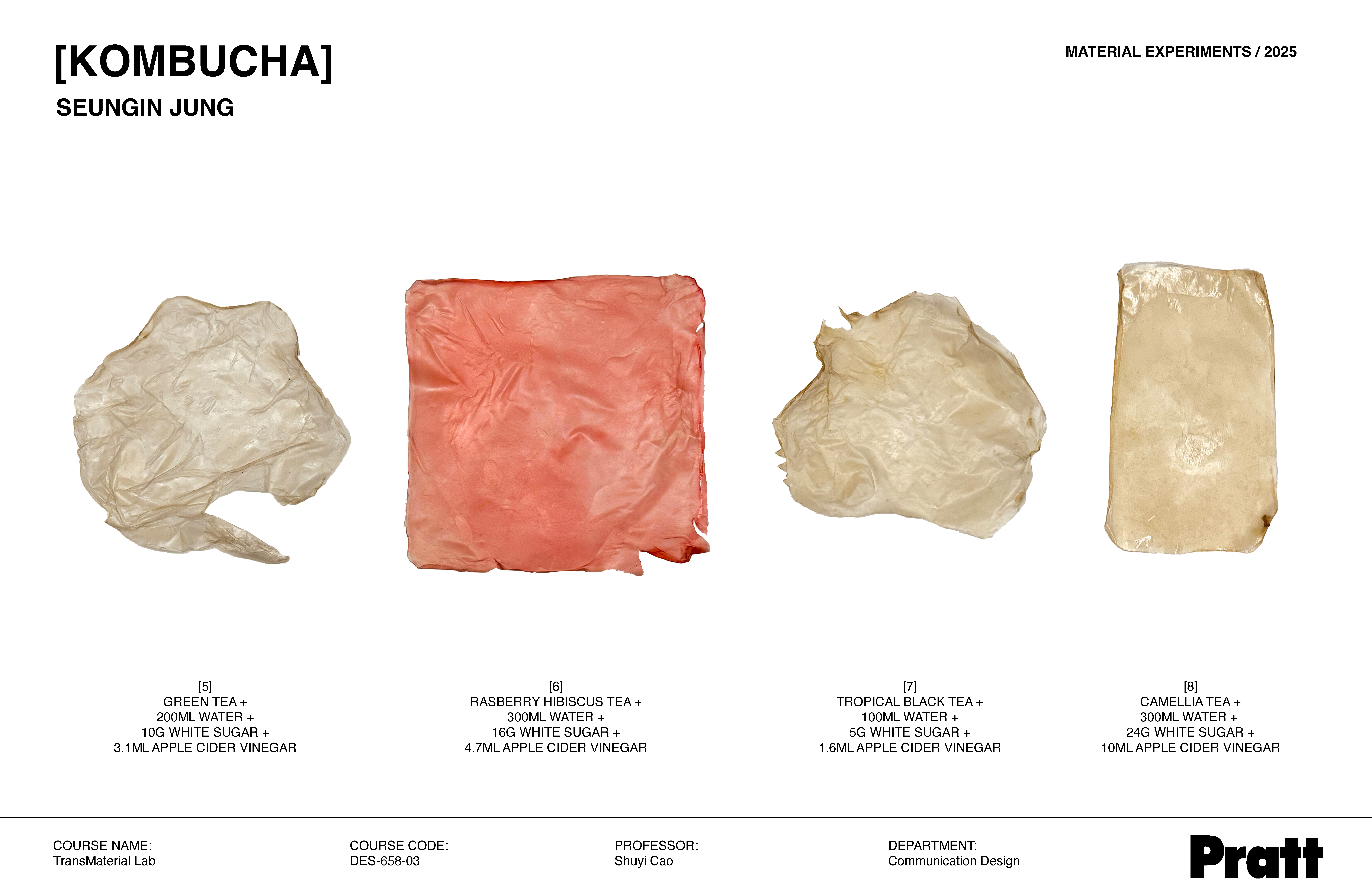 This material exploration investigates bioplastic and kombucha sheets as alternative, biodegradable materials derived from everyday food waste and natural ingredients. Through systematic experimentation, I tested different binders such as cornstarch, agar agar, gelatin, and sugar, combined with organic additives including onion skins, tea leaves, coffee grounds, eggshells, and fermented kombucha. The process involved boiling, mixing, fermentation, pouring, and drying to observe variations in color, translucency, texture, flexibility, and structural strength. By comparing recipes and material behaviors, this study examines how domestic, edible substances can transform into functional sheet materials, revealing the aesthetic and material potential of food-based bioplastics and microbial growth as design media.