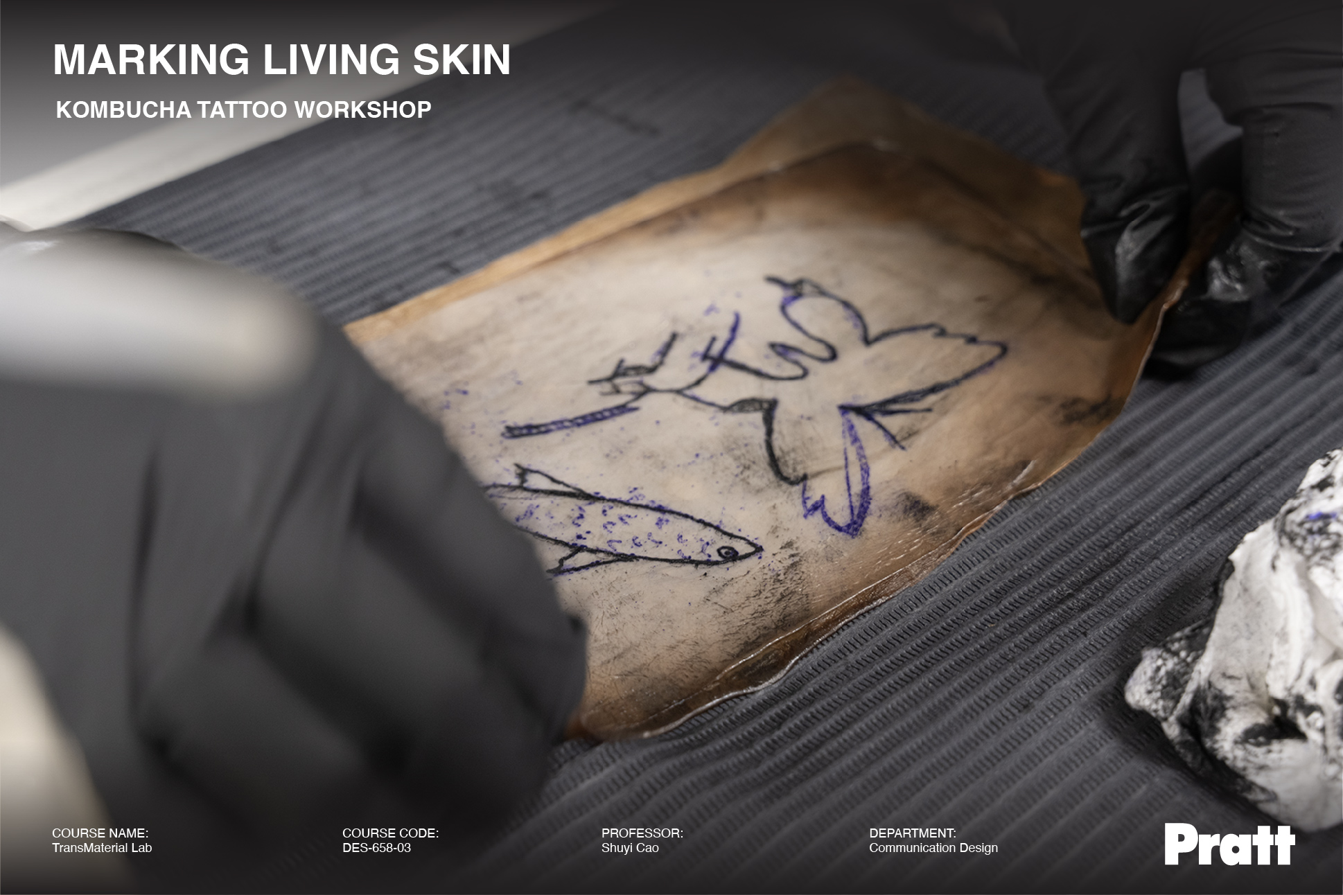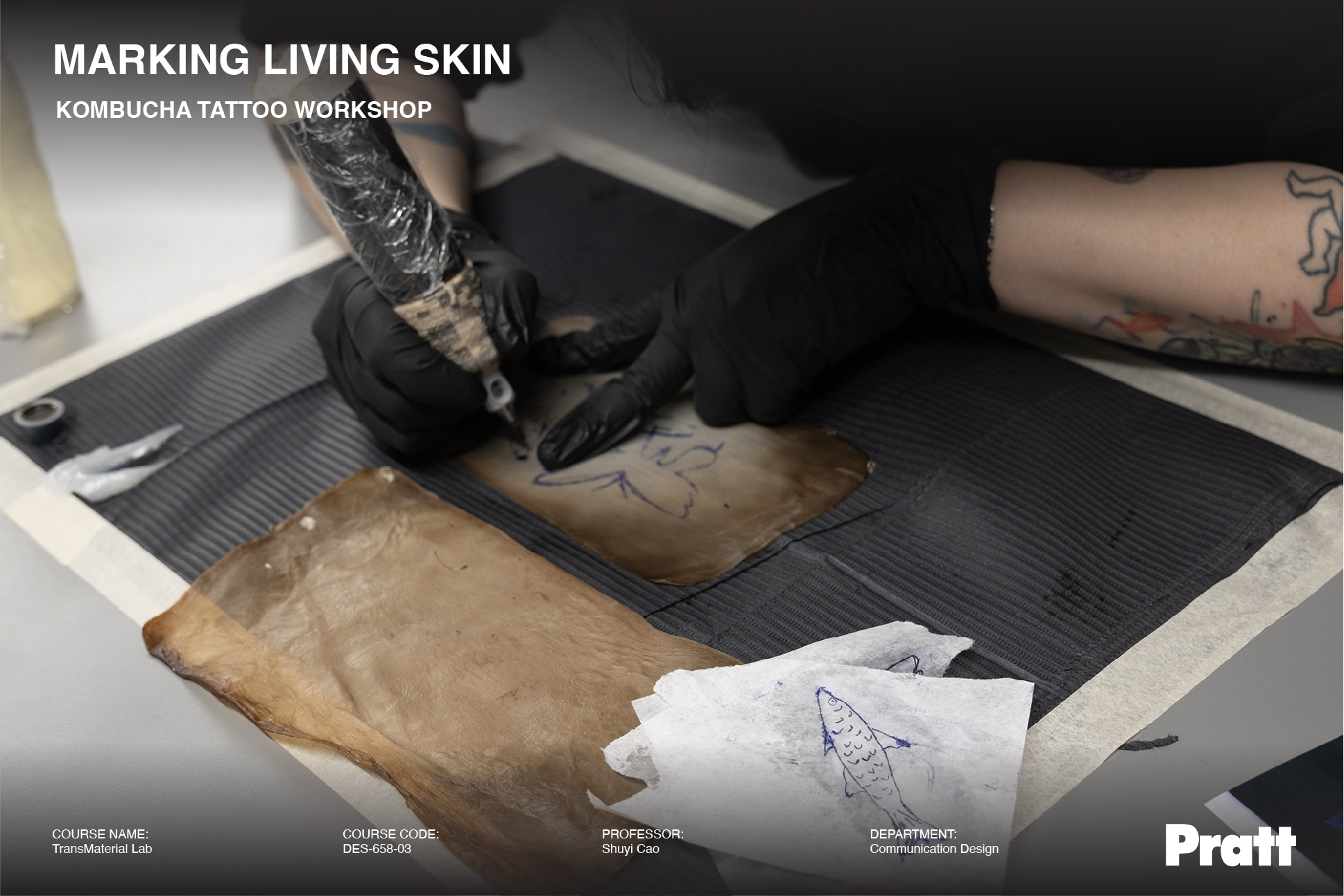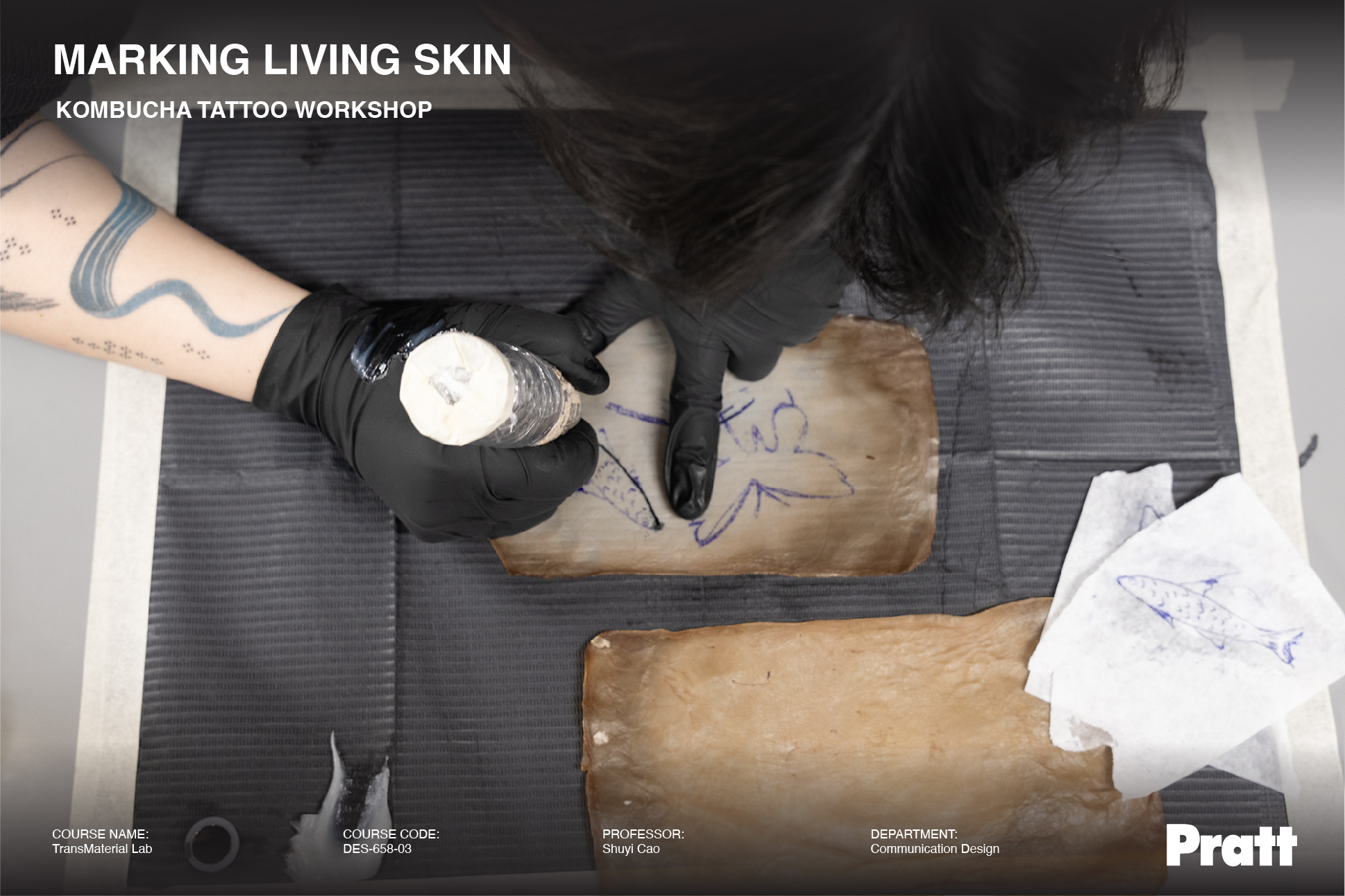 During this in-class workshop, student Yura Kang demonstrated an experimental tattooing process on kombucha leather, a bacterial cellulose biomaterial crafted by fellow student Yi-Chun Kuo.