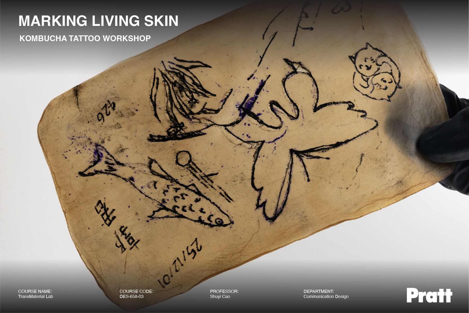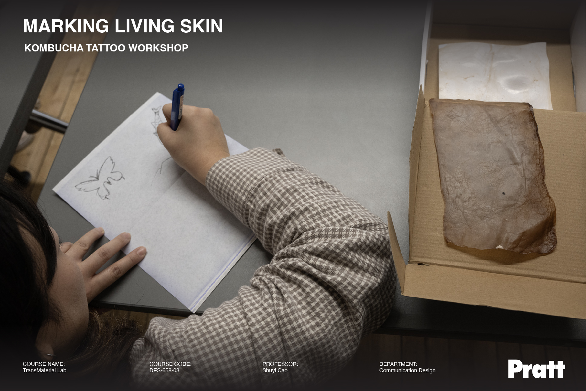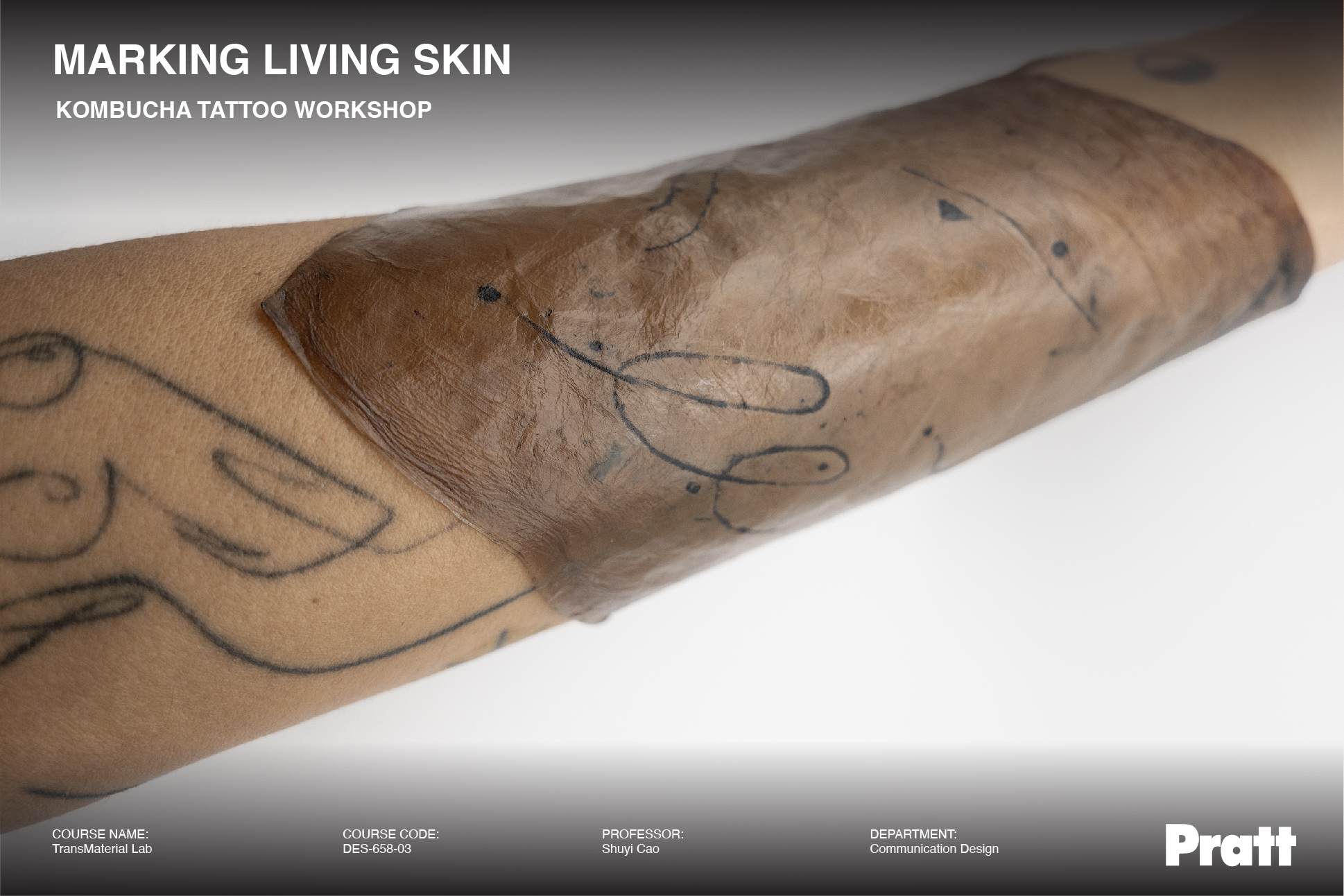 During this in-class workshop, student Yura Kang demonstrated an experimental tattooing process on kombucha leather, a bacterial cellulose biomaterial crafted by fellow student Yi-Chun Kuo.