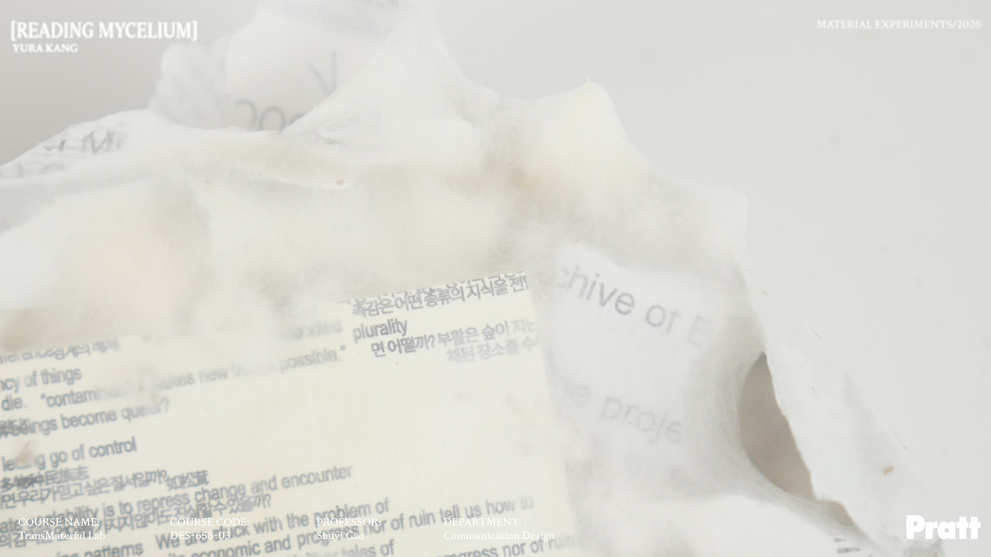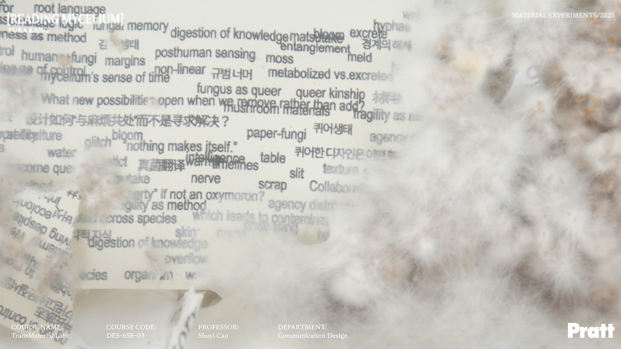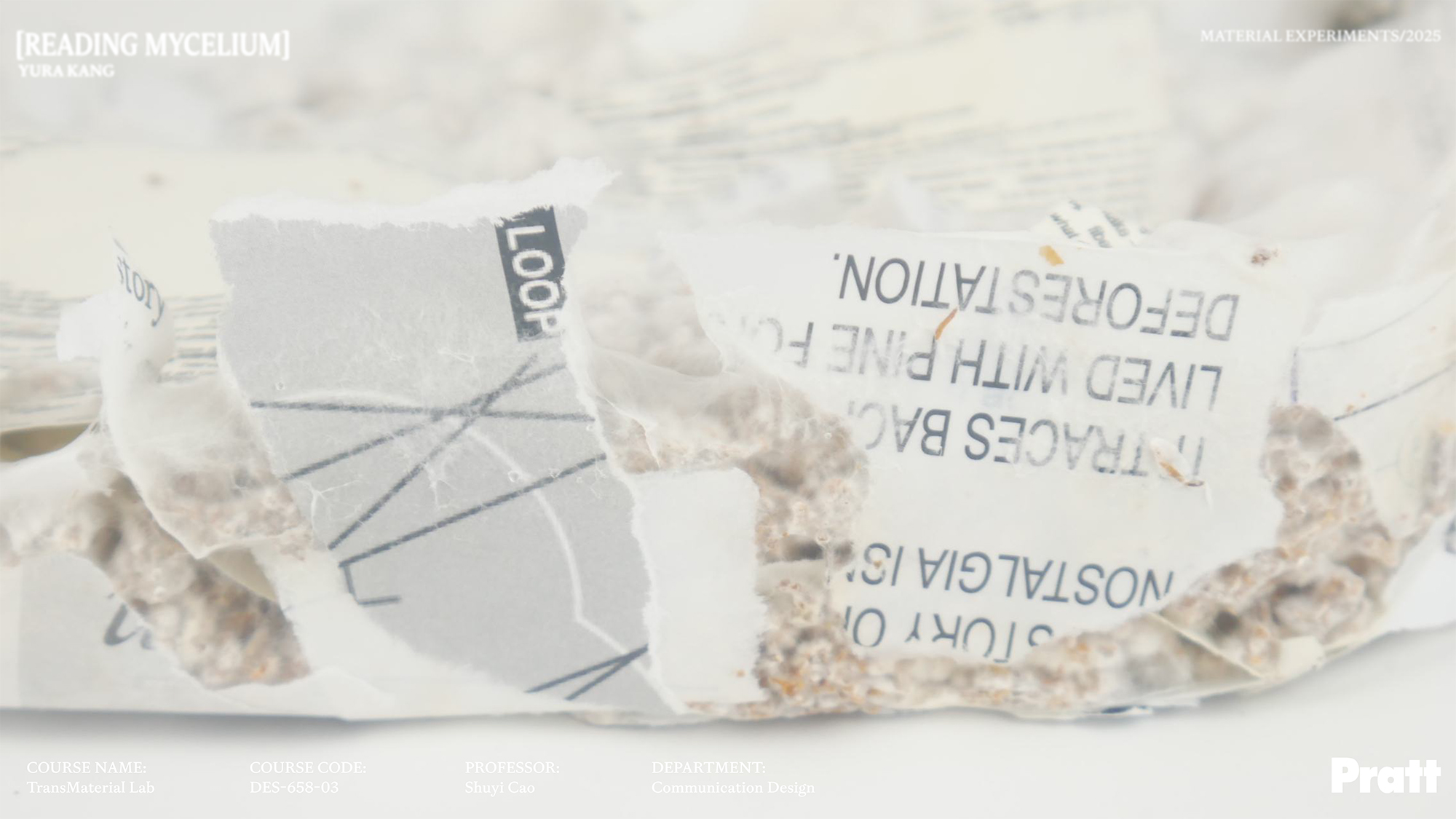 Situated between ecological material practice, posthuman design, and ritual, Reading Mycelium aligns with the course theme of Material Agency. Decomposition and colonization become a collaborative reading practice in which meaning emerges slowly, unevenly, and unpredictably.