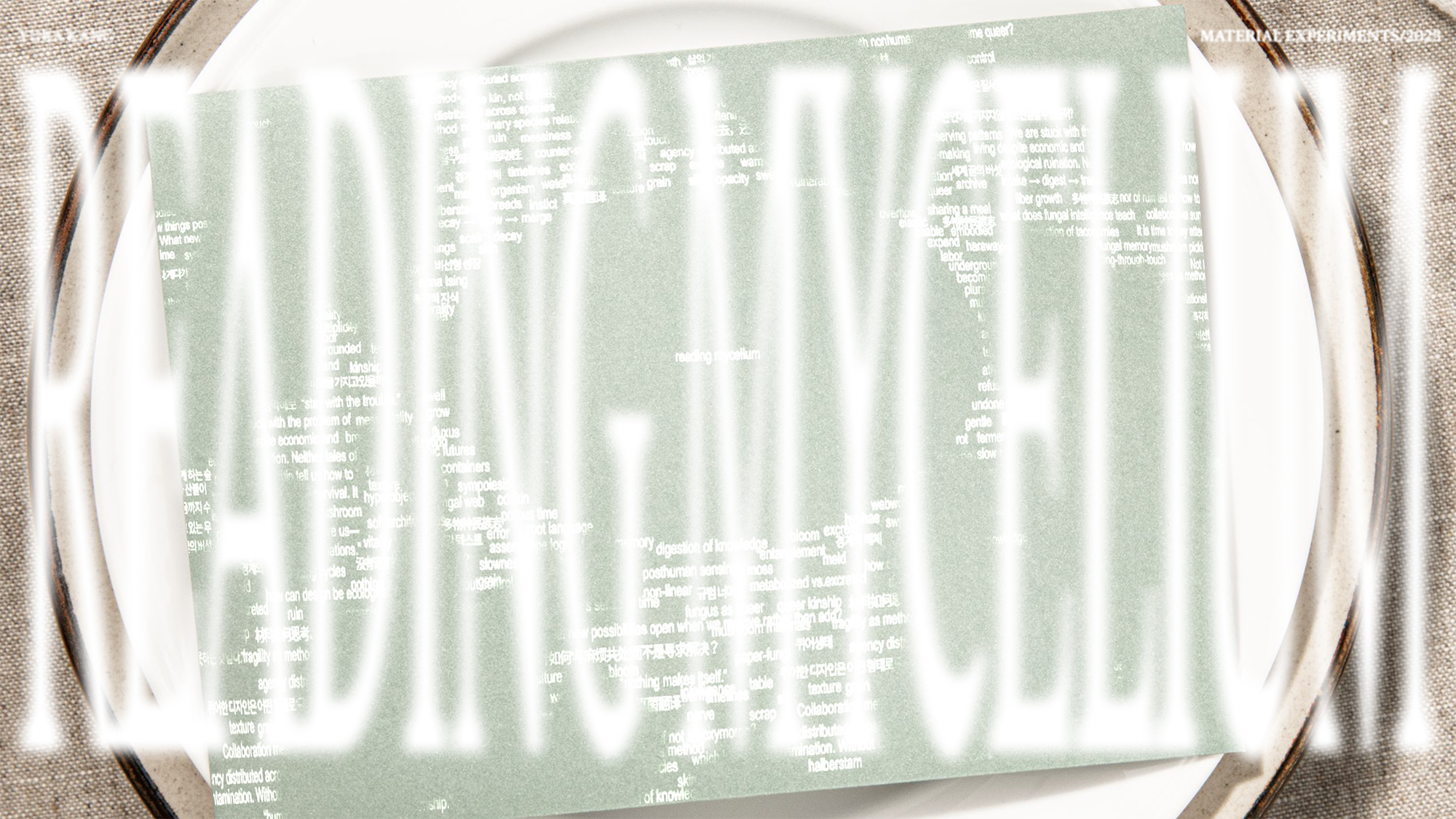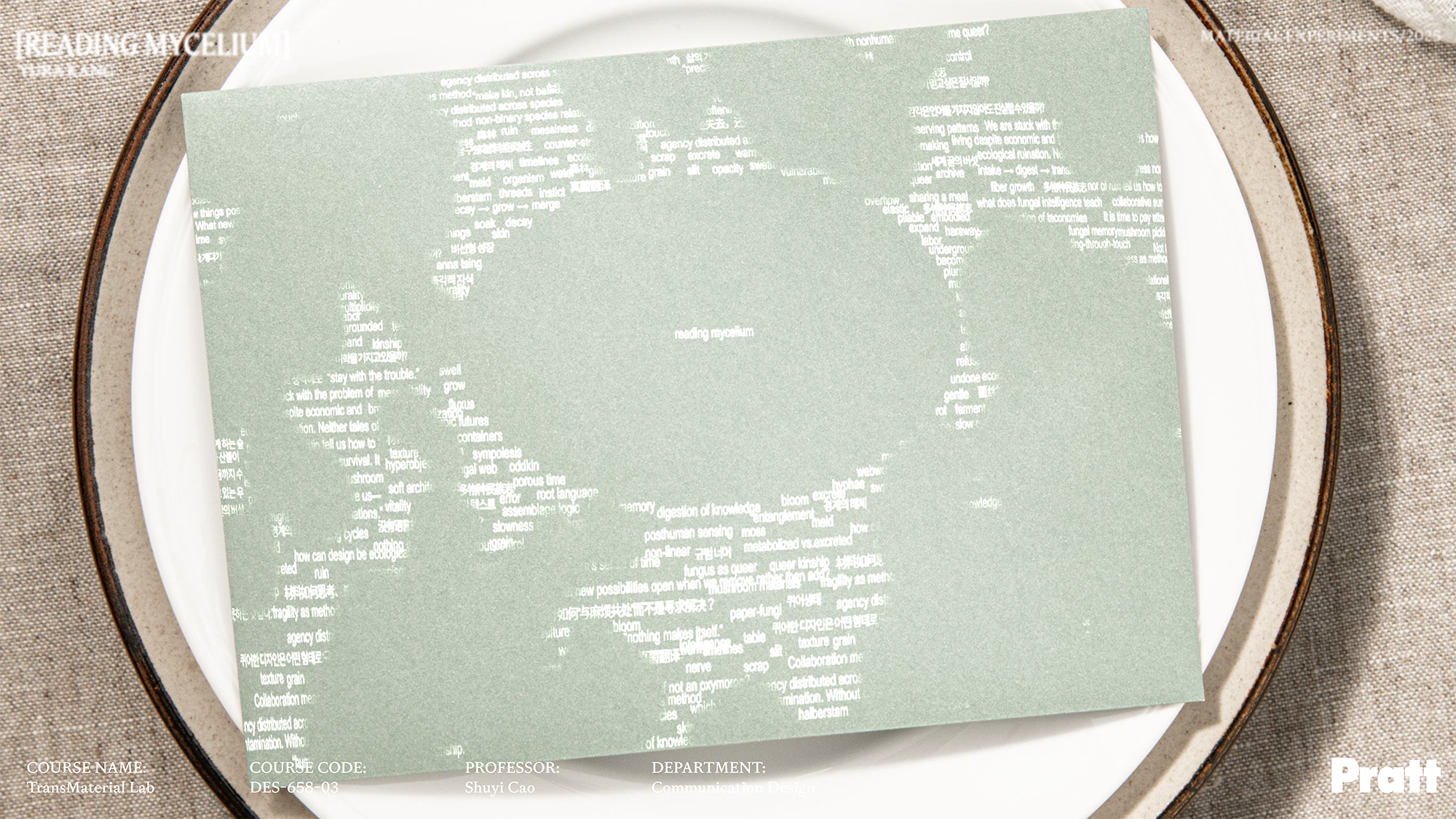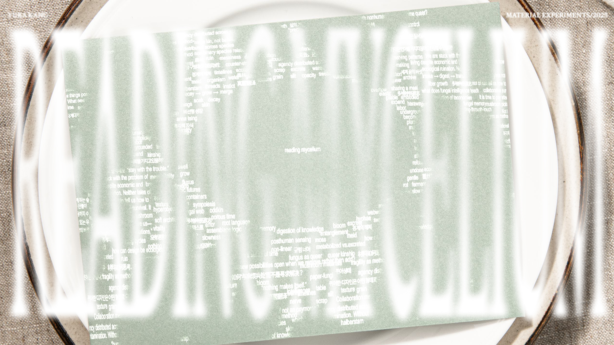 The final outcome takes the form of a small-scale mycelium-grown pattern layered over a system map of texts and a dinner-table invitation. The invitation functions as both a design artifact and a social gesture, calling participants to gather around the table as a site of shared reading, care, and conversation. The mycelial patterns trace what has been absorbed, transformed, and partially erased by the organism, while the system map visualizes the network of texts that fed the process. Together, they form a hybrid archive that records not only information, but the conditions of its digestion. Framing the table as a space for slow, collective reading, the work proposes design as a practice of hosting, metabolizing, and making space for what emerges across human and more-than-human systems.
