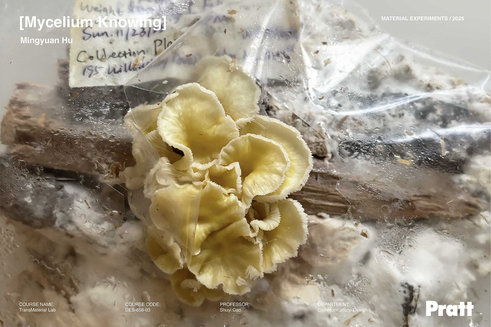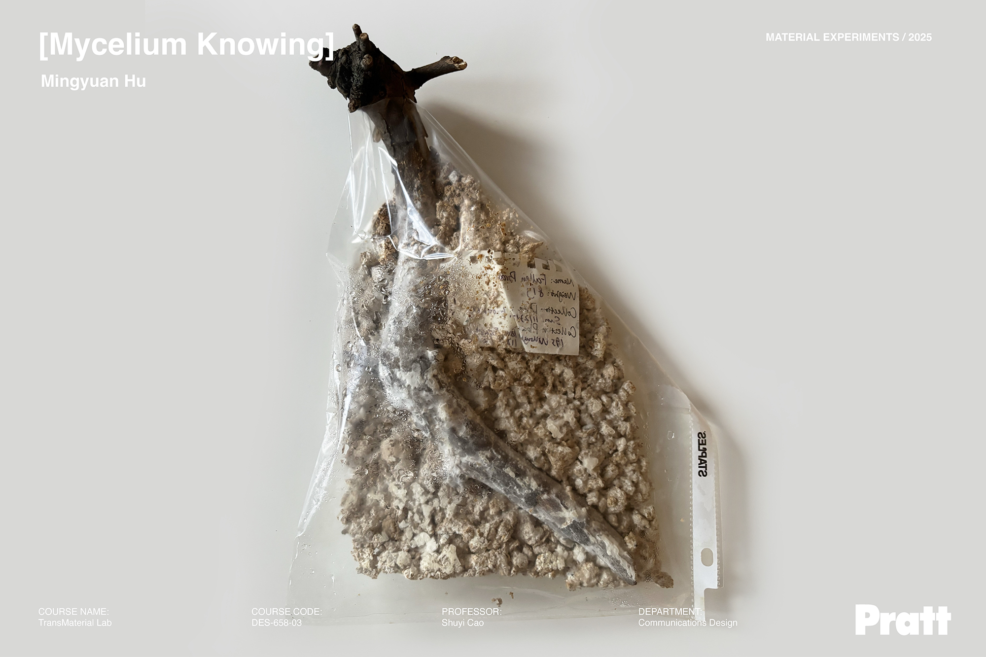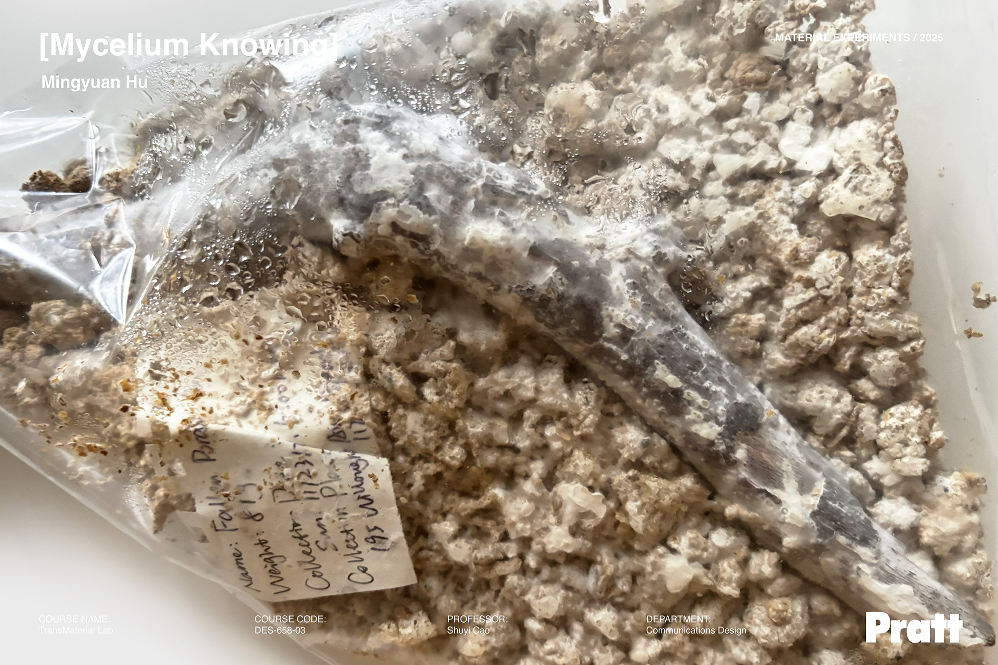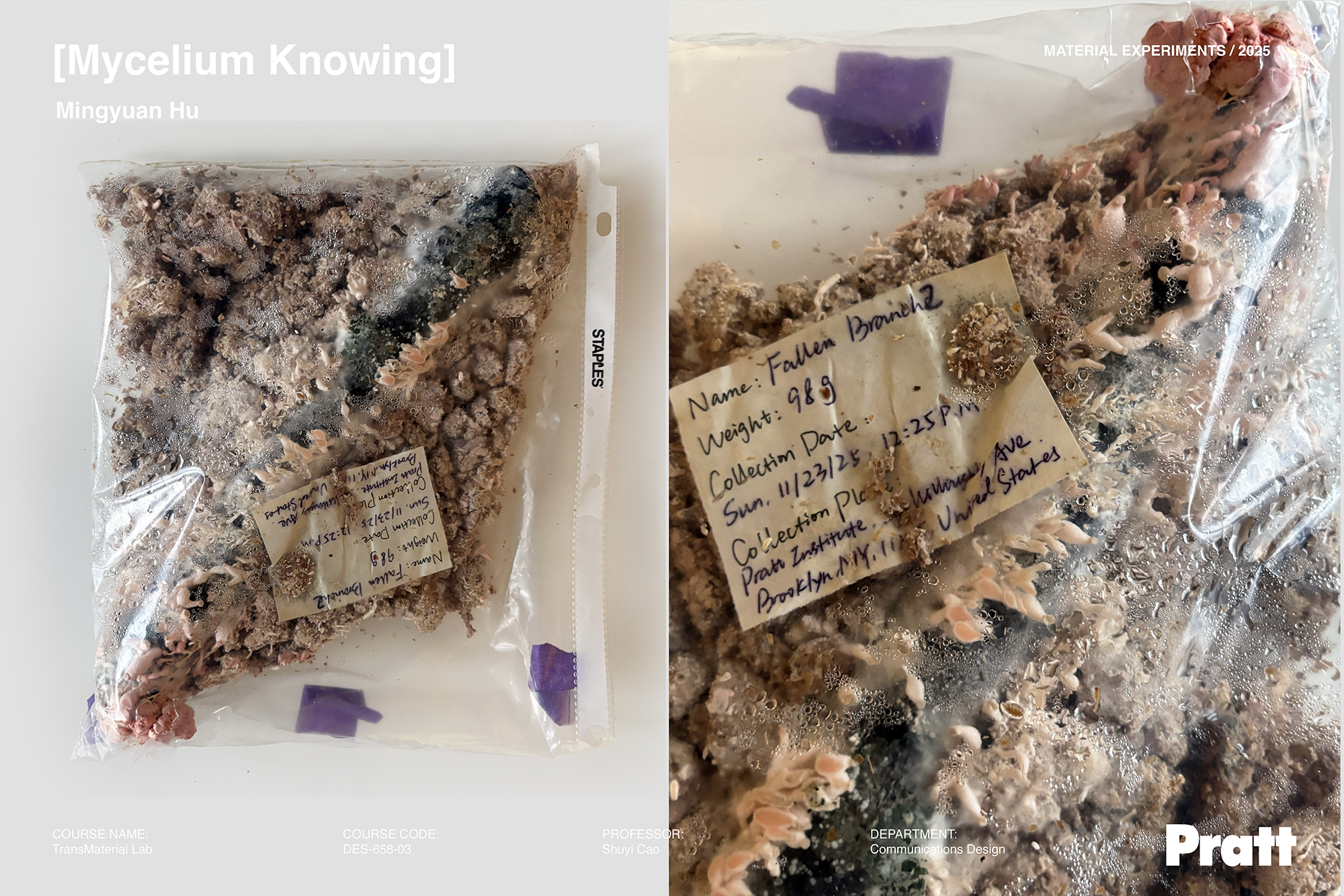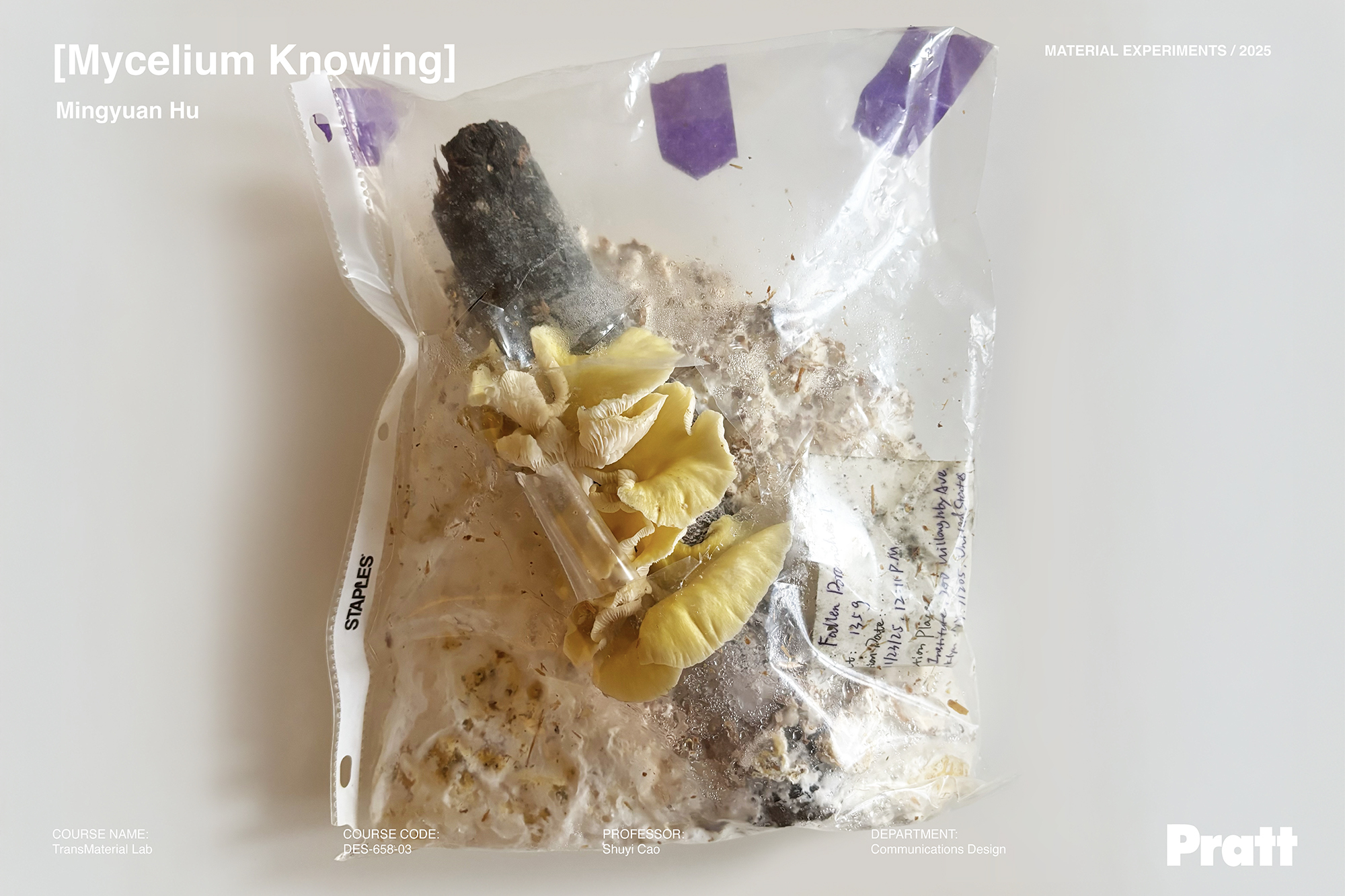 In this system, subjects and objects are not stable and pre-given, but shifting based on the changing condition and situation. Mycelium’s bodily knowing that is always towards touching and transforming, is entangled with the archival elements (for example, the sheet protectors and info labels) that embody the rational discourse of humans’ ways of recognition. This tension is at the heart of the project’s narrative: here, human rational-discursive paradigms of knowing and mycelium’s bodily sensing co-constitute a site in which different ways of knowing are shown to actively participate in the enactment of materiality itself.